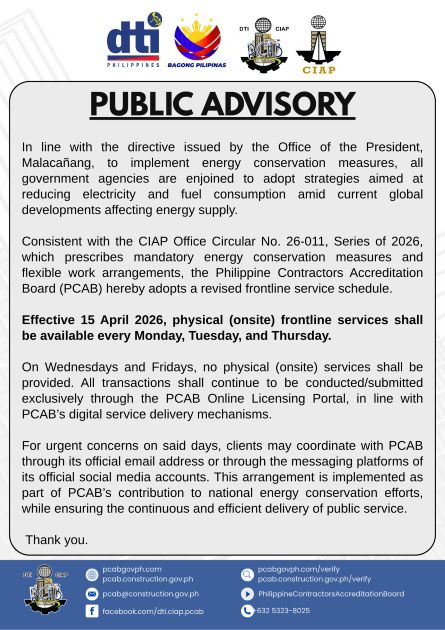 PCAB is a government agency attached to the Department of Trade and Industry and is one of the implementing Boards in the Construction Industry Authority of the Philippines (CIAP).